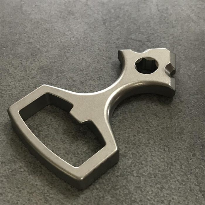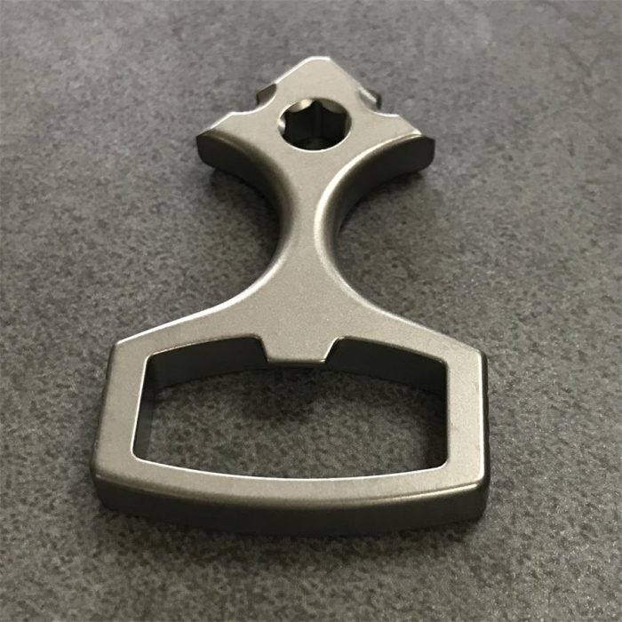Multi-functional self-defense bottle opener, made of titanium alloy, integrates bottle opener, self-defense window breaking and maintenance functions, and can be hung in the key chain and carried with you.